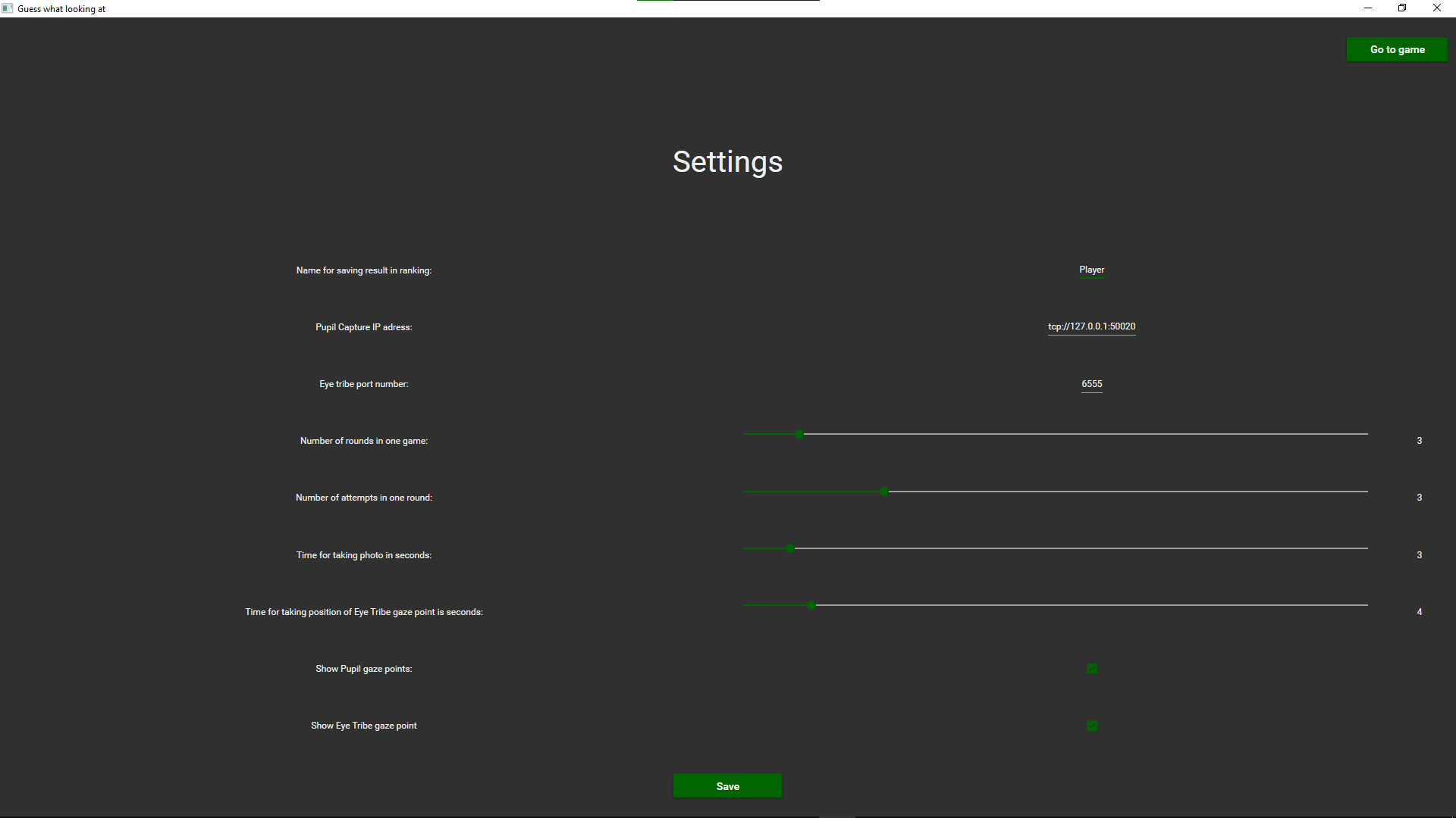 Next you should run Pupil Capture, wear Pupil Labs Core eye tracker, set cameras up[1][2] and calibrate eye tracker. If second player wants to inidicate points by The Eye Tribe, he/she should run EyeTribeServer and EyeTribe UI, next calibrate eye tracker in Eyetribe UI. At the end build GuessWhatLookingAt WPF application.